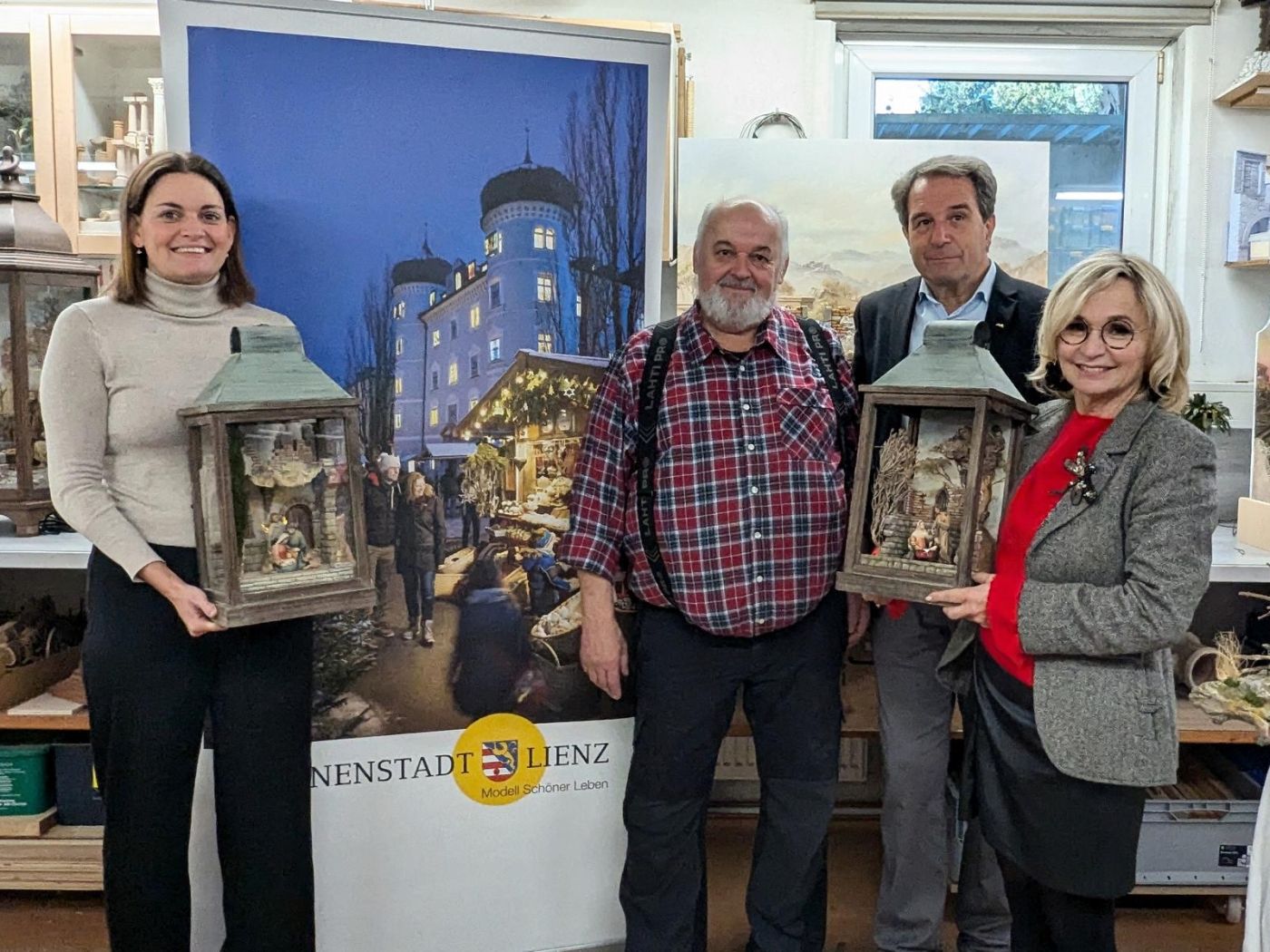 Adventmarkt Präsentation in Lienz (vl .) Eva Karré (Obfrau des Sozialausschusses der Stadt Lienz), Heinrich Sorko (Obmann Krippenverein Lienz), Franz Theurl (Obmann TVB Osttirol), Bürgermeisterin Elisabeth Blanik