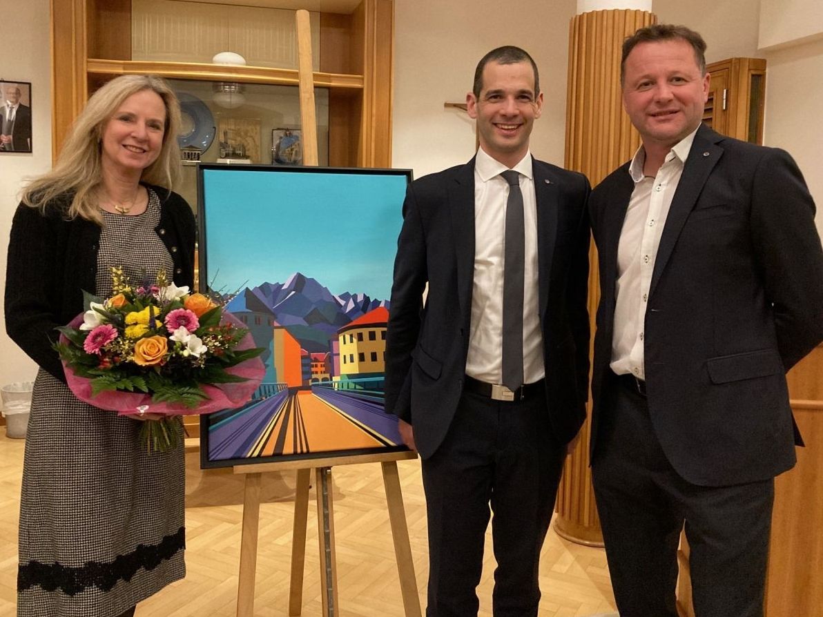 Christine Brugger stellte die Kunstwerke vor, hier mit Bild Nr. 12 "Lienz" von Lewis J. Blake, Round Table Präsident Thomas Forcher und Auktionator Stefan Taferner. Foto: Stangl