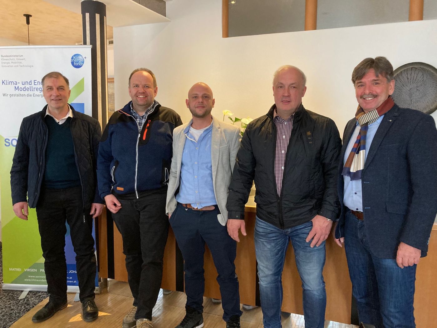 vl: Bgm Raimund Steiner (Matrei), Bgm Gottfried Islitzer (Prägraten), KEM-Manager Thomas Steiner, Bgm Franz Gollner (St. Johann) und PV-Obmann Bgm Dietmar Ruggenthaler (Virgen). Foto: Stangl