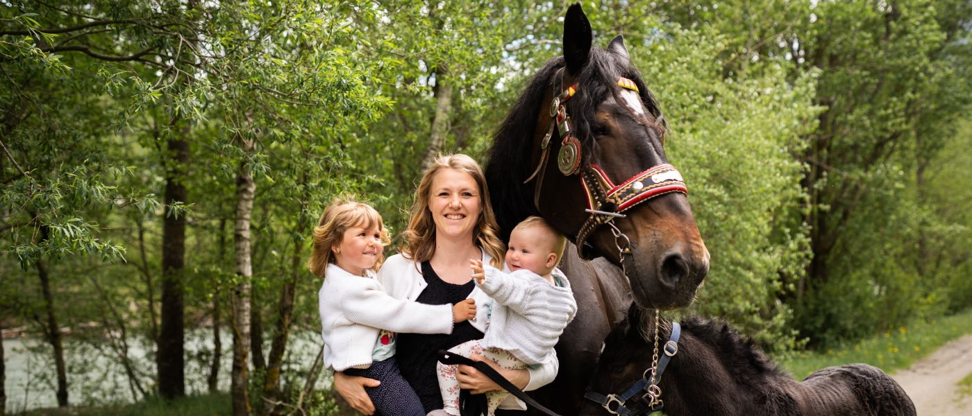 Wahrscheinlich ist der Schapperhof im Matreier Ortsteil Proßegg das, was man sich unter einem idyllischen Tiroler Bauernhof vorstellt: Vorne der Tauernbach, hinten der Hintereggkogel. Johann „Hansl“ Steiner hält hier Kühe, Hühner – und Norikerpferde. „Sie sind seine große Leidenschaft“, sagt Jackline Wibmer aus Virgen. Und auch die – seit der Kindheit pferdeverrückte Mutter von Amelie (3) und Katharina (bald 1) hält hier Norikerpferde.