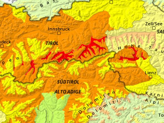 Am Montag kann es zeitweise regnen, die Schneefallgrenze liegt meist oberhalb von 2.500 Metern Seehöhe. Mit der Durchnässung der Schneedecke steigt die Gefahr von Nassschneelawinen deutlich an. Betroffen sind am Montag laut der Landeswarnzentrale vor allem: Weißkugelgruppe, Gurgler Gruppe, Stubaier Alpen Mitte, Zillertaler Alpen Nordwest, Zillertaler Alpen Nordost, Venedigergruppe sowie Glocknergruppe Süd.