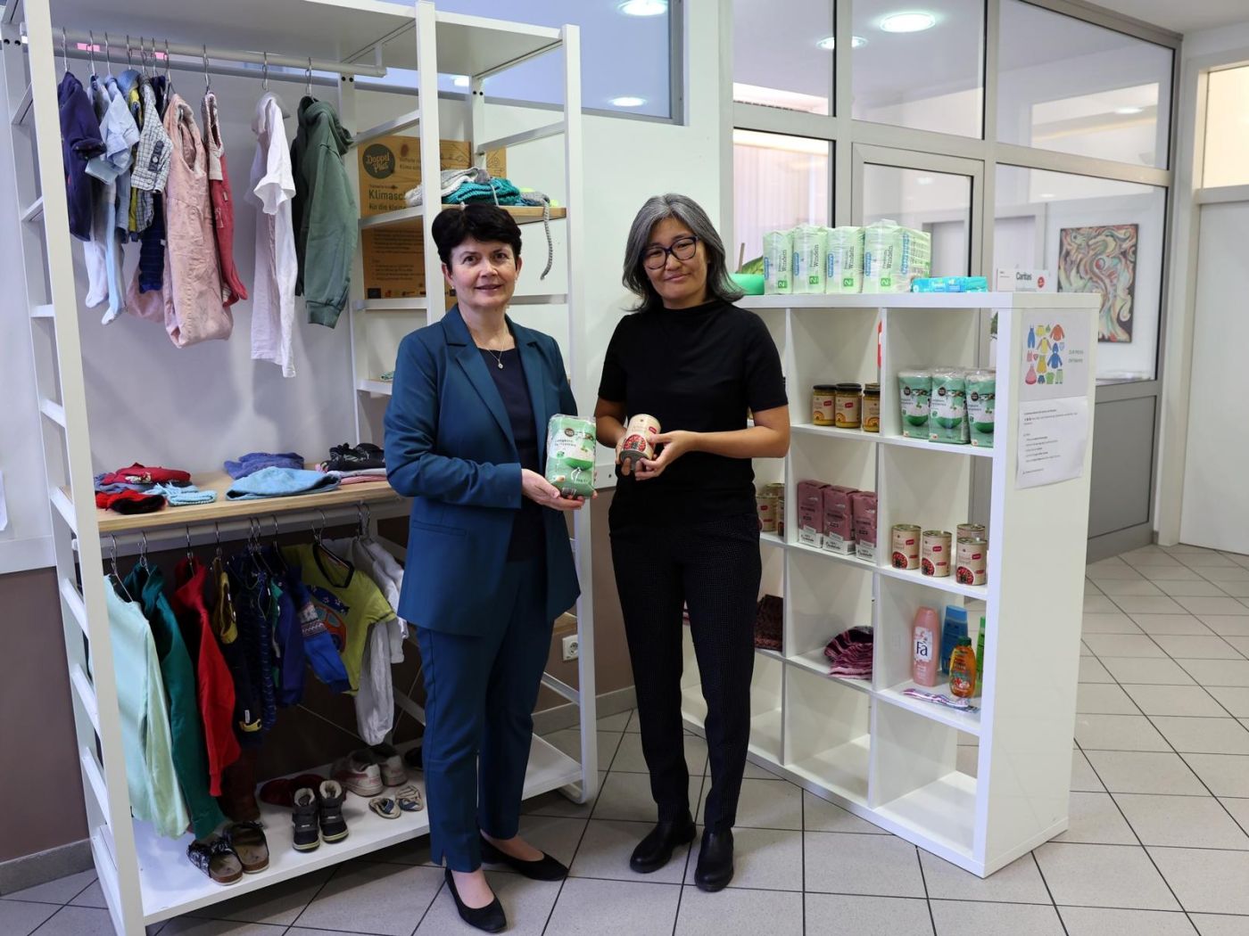 Für viele reicht das Geld für das Grundlegendste nicht mehr. Caritas Direktorin Elisabeth Rathgeb (l.) und Somi Jochum, Leiterin der Caritas-Sozialberatung, informierten über die aktuelle Lage in Tirol und präsentierten ein Regal mit Grundnahrungsmitteln für die Klient*innen der Sozialberatung. Foto: Caritas Tirol/Giesinger