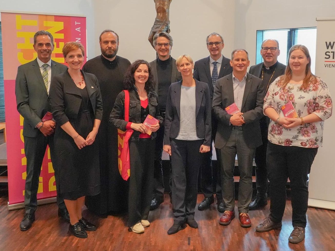 v.l.: Walter Peer (Wiener Städtische), Brigitte Luftensteiner (Chorverband Tirol), Erzpriester Aleksandar Stolic (Serbisch-Orthodoxe Kirche), Karin Bayer-Ortner (Fachreferentin Diözese Innsbruck), Pfarrer Werner Geißelbrecht (Christuskirche), Pfarrerin Silke Dantine (Christuskirche), Superintendent Olivier Dantine (Evangelische Superintendentur A. B. Salzburg und Tirol), Pfarrer Wolfgang Meixner (Pfarre Saggen), Bischof Hermann Glettler (Diözese Innsbruck) und Sabine Meraner (Pfarre Saggen). Foto: Diözese Innsbruck/Cincelli