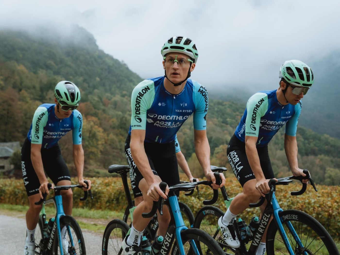 Wer in der kommenden Saison Radrennen im Fernsehen verfolgt, sollte auf minzgrüne Helme achten. Sie sind nämlich das neue Erkennungsmerkmal des Teams Decathlon AG2R LA Mondiale von Felix Gall. Präsentiert wurde der neue Look am Montag in Lille (Frankreich). Und auch das neue Aeromodell des Ausstatters Van Rysel wurde offiziell vorgestellt (in Rennen kam es allerdings schon zum Einsatz). Allerdings rückte dieses wegen der zeitgleichen Präsentation des ausgefallenen neuen Arbeitsgerätes von Superstar Tadej Pogačar in den Hintergrund.