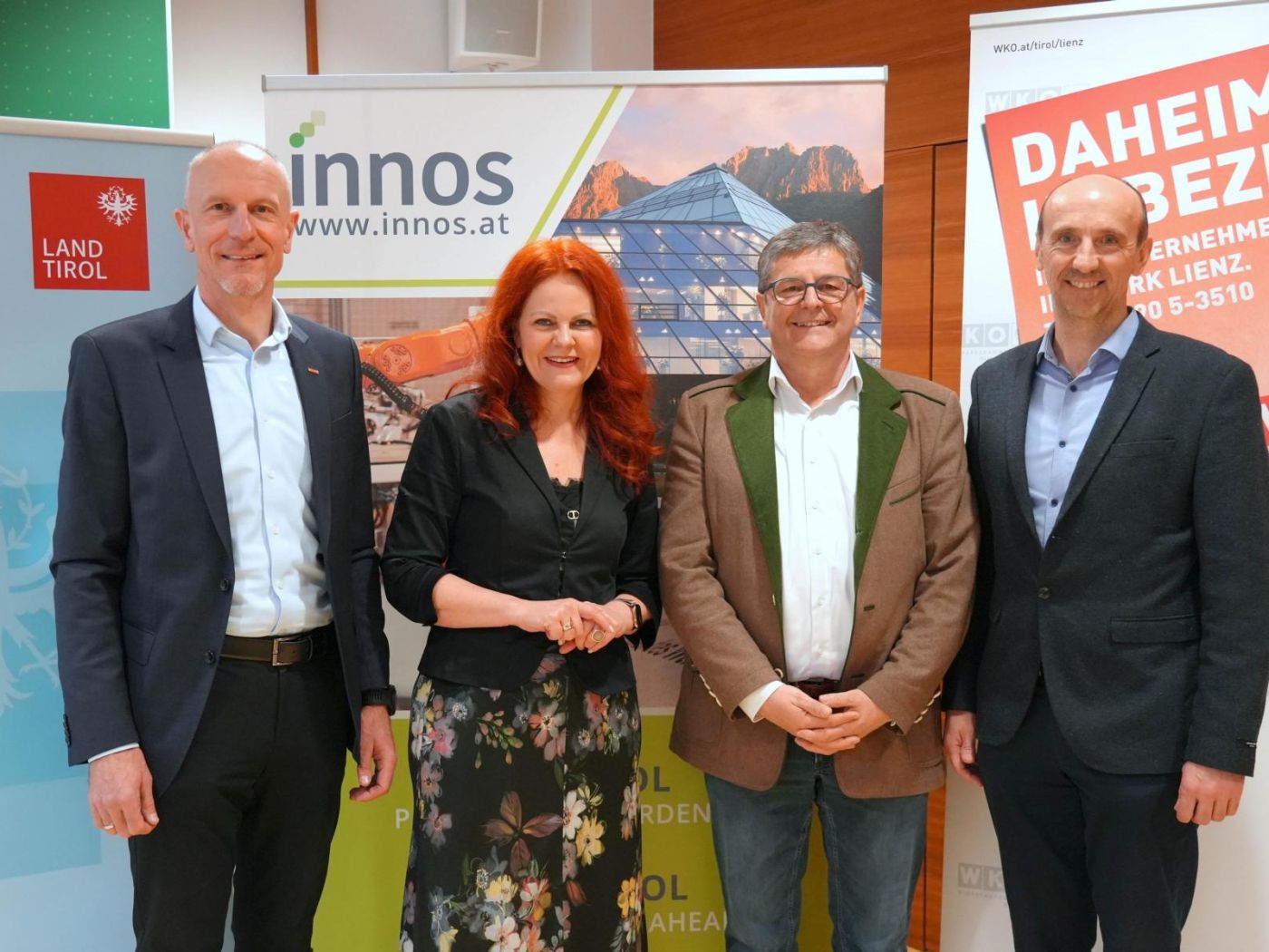 Bei der Eröffnung des neuen MINT-Labs in der Tiroler Fachberufsschule (TFBS) Lienz (v.li.): Johann Kollreider (Bezirksstellenleiter der Wirtschaftskammer Tirol in Lienz), LRin Cornelia Hagele, Reinhard Lobenwein (Geschäftsführer der INNOS GmbH) und Direktor der TFBS Lienz Klaus Oberegger. Foto: Land Tirol/Krepper