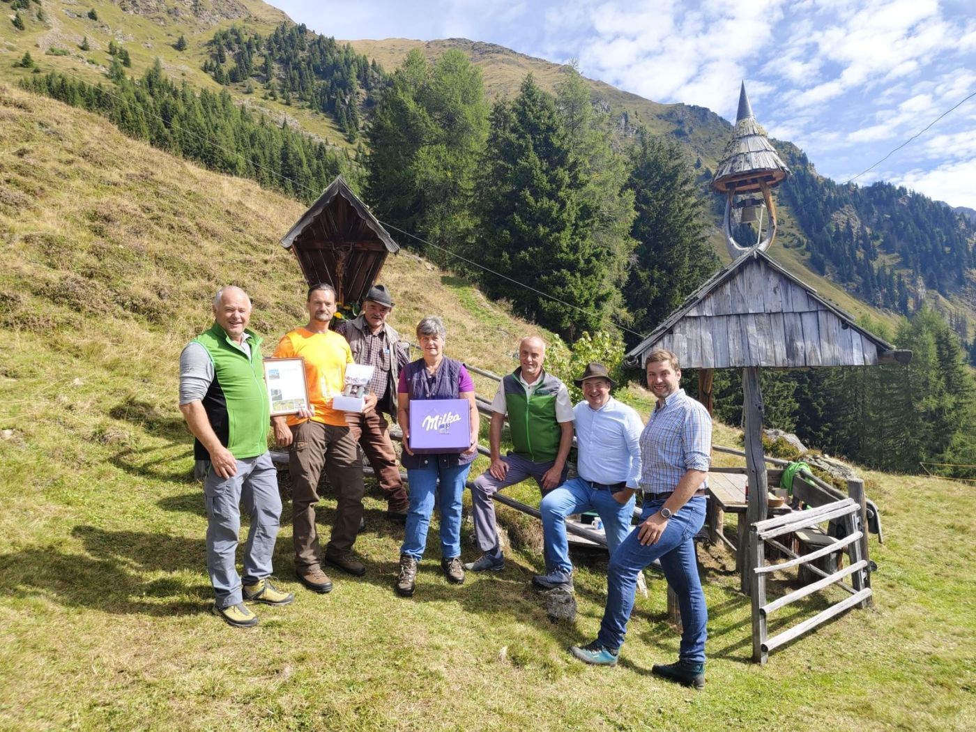 Philipp Jans, stellvertretender Vorsitzender des Tiroler Nationalparkkuratoriums, freut sich über das große Engagement des „Almhirten des Jahres“ Thomas Veiter. Damit trägt er dazu bei, dass die einzigartigen Landschaften und Lebensräume des Nationalparks Hohe Tauern erhalten bleiben. Vertreter des Kuratoriums und Nationalparkdirektor Hermann Stotter haben Thomas auf der Mellitz-Alm mit einer süßen Überraschung und einem Fernglas zur Prämierung gratuliert.