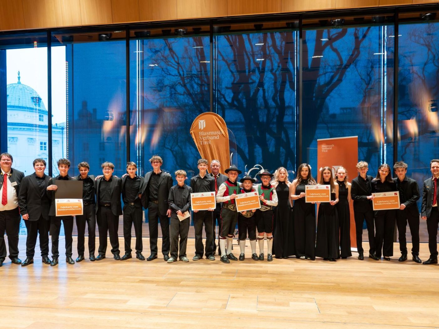 Die Tiroler Vertreter:innen für den Bundeswettbewerb: v.l.: Landesjugendreferent-Stv. Patrick Oberdanner, Trompetissimo, TERRAPAX, Trombauders, Brisk Clarinets, Sine Nomine, Landesjugendreferent Hannes Tipelius, Foto: Sigl
