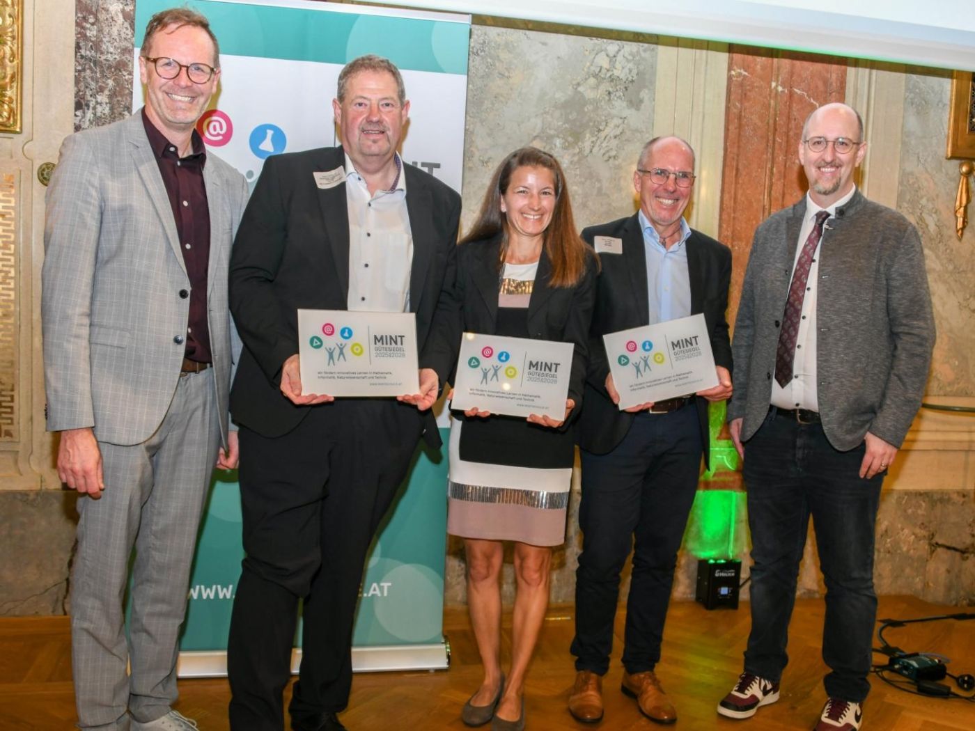Die feierliche Verleihung fand im Haus der Industrie am Wiener Schwarzenbergplatz statt. Auch Tiroler Gratulanten waren zur MINT Gütesiegel Verleihung nach Wien gekommen um den Osttiroler Schulen ihre Anerkennung auszusprechen v.l. Geschäftsführer der Industriellenvereinigung Tirol DI (FH) Mag. Michael Mairhofer, Schulclusterleiter Dir. Markus Tönig (Volksschulen Hopfgarten i.Def. und St. Veit i.Def.), Dir. Maria Thor-Frank (Volksschule Grafendorf), Dir. Andreas Strasser (Mittelschule Sillian) und Mag. Dr. Claudio Landerer, Bakk. (Bildungsdirektion Tirol/Fachstab). Foto: Markus Prantl