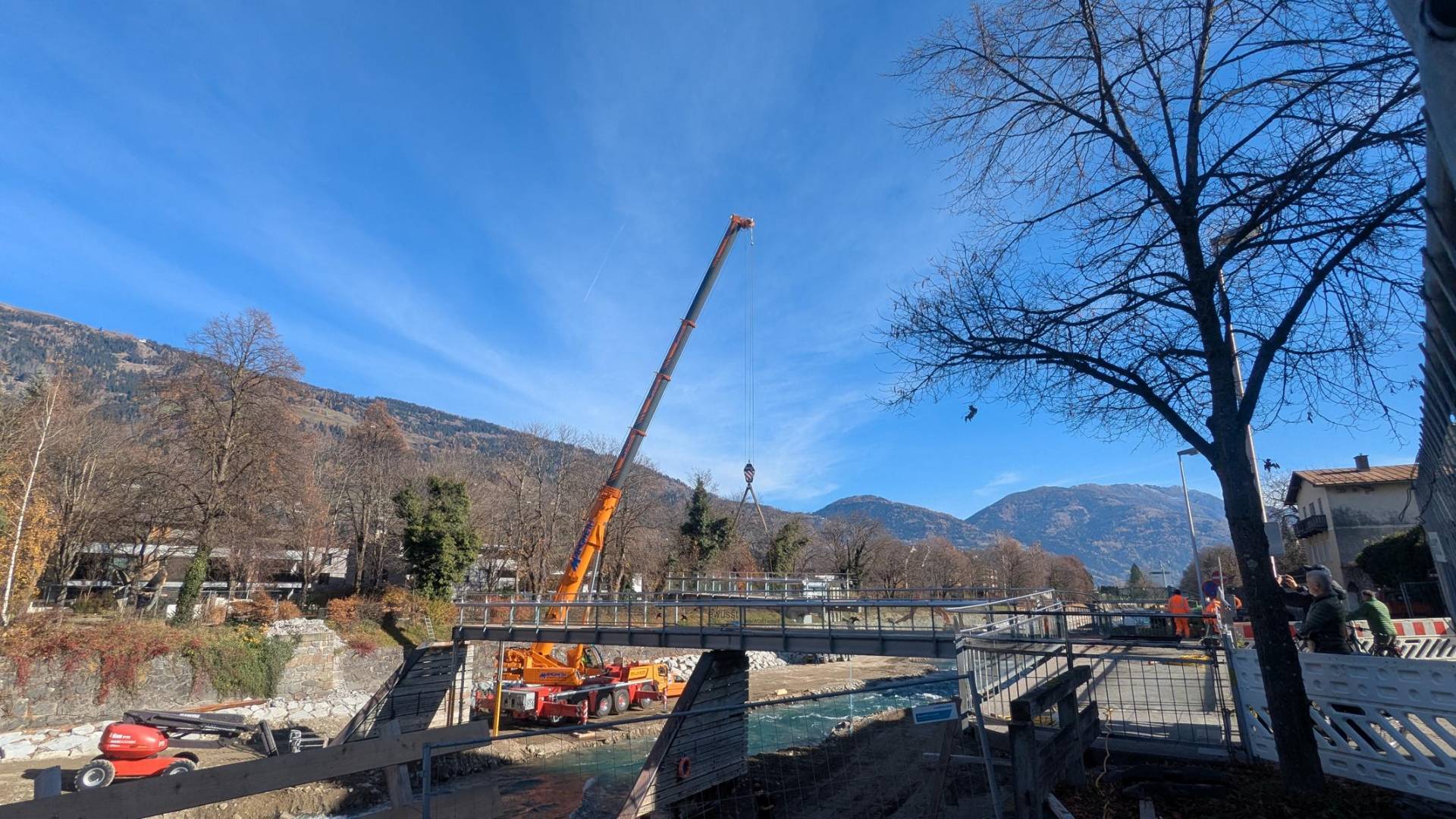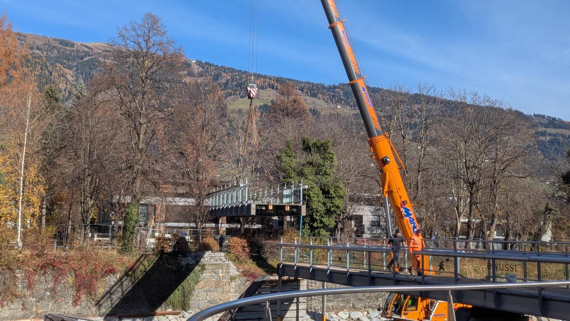 Der Iselsteg verschwindet. Die ersten Brückenelemente wurden am Mittwochvormittag abgebaut.