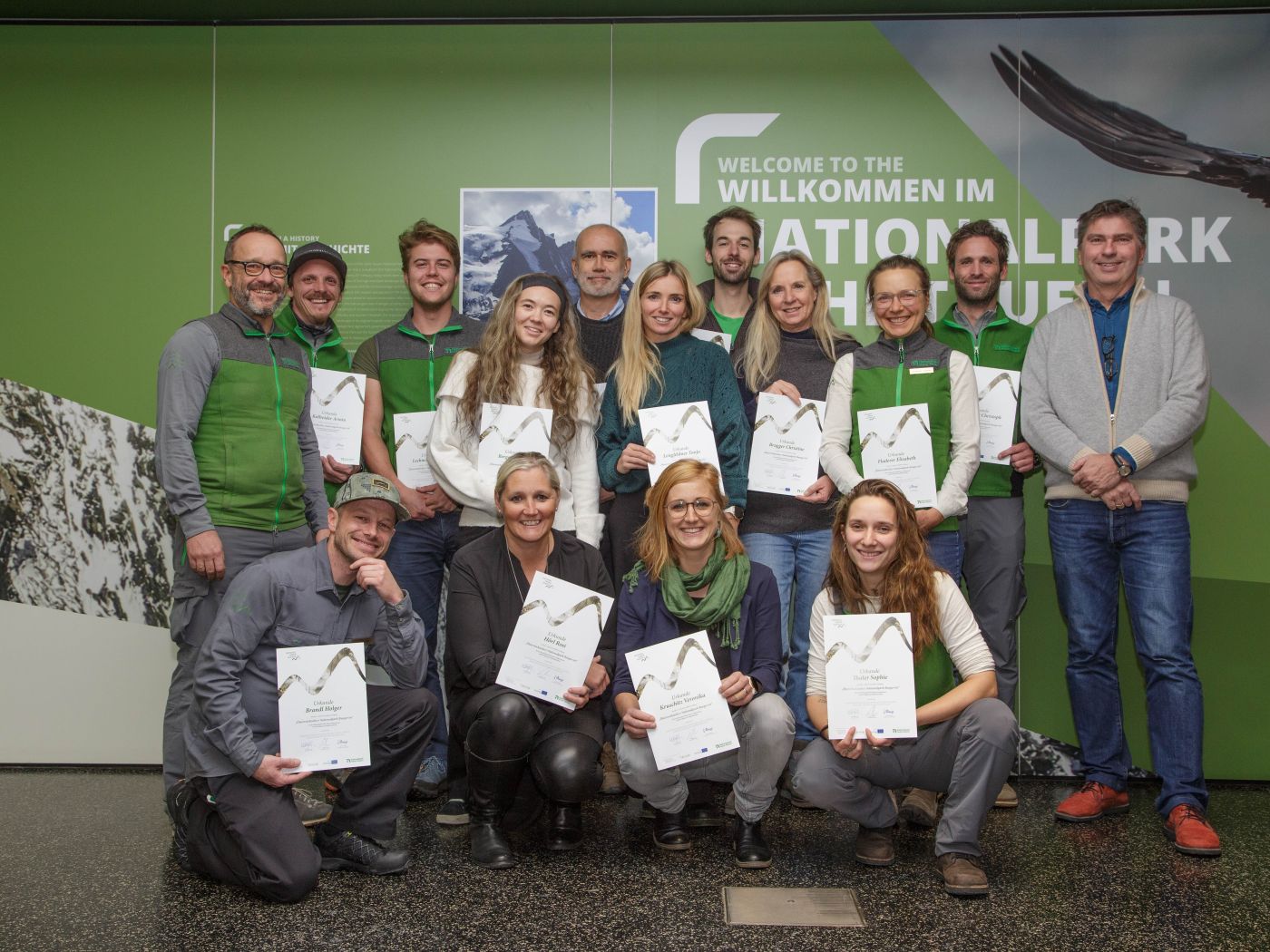 Insgesamt gibt es im ganzen NPHT 13 neue zertifizierte Österreichische Nationalpark-Ranger:innen, hier mit Prüfungskommission, Foto: NPHT, Baldinger