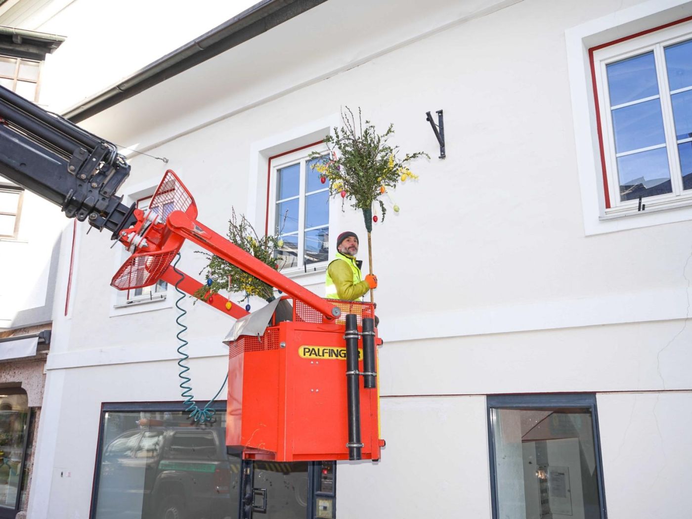 Roland Mitteregger von der Stadtgemeinde Lienz montierte mit seinen Kollegen die Palmbesen an den Fassaden, Fotos: Stadt Lienz/Lenzer