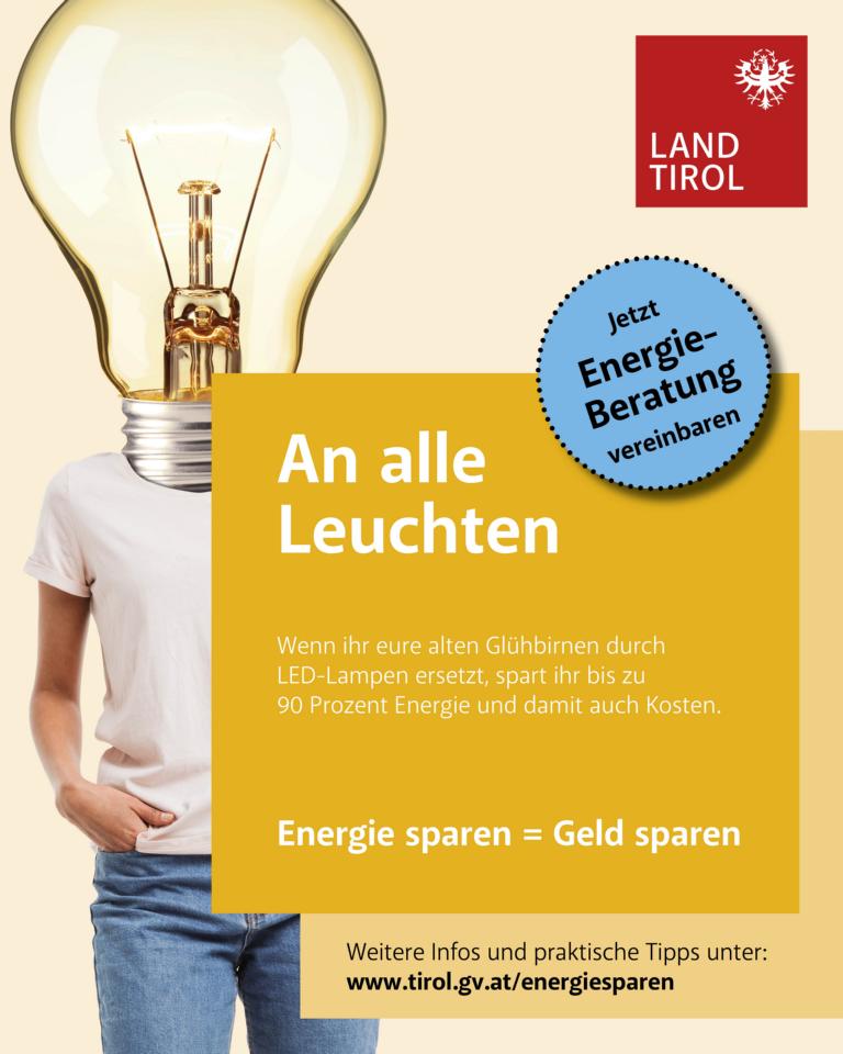 Die Energie Tirol und das Klimabündnis bieten zusätzlich Beratungen an. Und Informationen rund um finanzielle Entlastungen und Förderungen von Bund und Land finden Sie unter www.tirol.gv.at/entlastungen