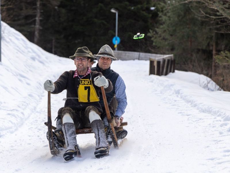 27 Teams kämpften beim dritten Nostalgie Hornschlittenrennen des Vereins Naturrodelbahn Lienzer Dolomiten um die beste Mittelzeit - und das auf historischen Hornschlitten und mindestens ebenso in alten Gewändern.