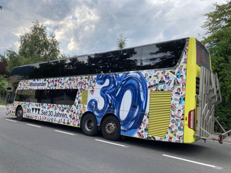 Zwischen Lienz und Innsbruck fährt einer der bunten Jubiläumsbusse, die der Verkehrsverbund Tirol zum 30-Jahr-Jubiläum auf die Strecke schickt. Beklebt mit Fotos von Menschen aus Osttirol.