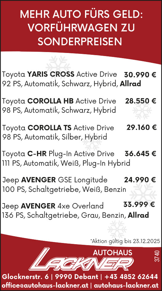 Verkaufe vier neuwertige Winterreifen 245/70 R16 111T, € 399,‑. Tel. 0664-73108938.